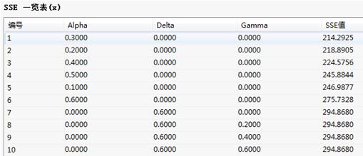 本例中系统将根据这三个参数进行网格扫描生成指数平滑模型,在“SSE一览表”中列出10个最佳模型的SSE值,并给出最优模型的拟合序列值和残差值。