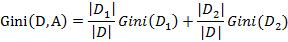 基尼指数Gini(D)表示集合D的不确定性,基尼指数Gini(D,A)表示经A=a分割后集合D的不确定性。基尼指数值越大,样本集合的不确定性也就越大。