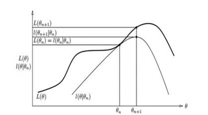 由于模型中存在隐含变量,并不能直接采用极大似然估计法,或贝叶斯估计法,估计上述模型的参数。EM算法能够通过不断求解下界的极大化逼近,来求解对数似然函数,如图(1)所示。